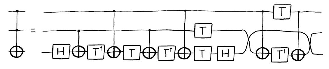 Let us examine the three-qubit system above with $\Ket a$, $\Ket b$ and $\Ket c$, with the last one being the target qubit (acted upon).